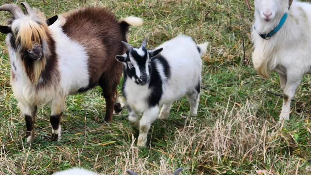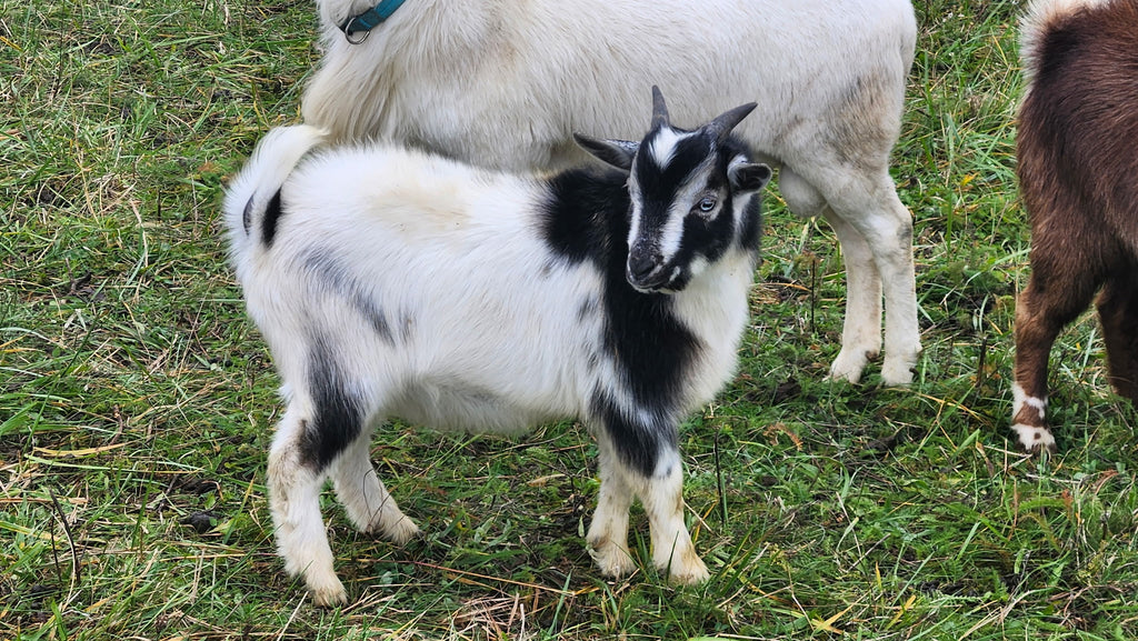 Cupcake is an adorable young buck with striking black markings on a white coat — full of personality and potential! His sire, Snickers, is a proven Nigerian Dwarf buck, and his dam, Elsa, is a Nigerian Dwarf doe with excellent mothering instincts. This makes Cupcake approximately 75% Nigerian Dwarf and 25% Pygmy, giving him the compact build, hardiness, and friendly nature both breeds are known for.
